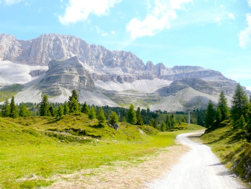 Throuh a cool valley, we are biking over fire roads towards Madonna di Campiglio. The steep climb to the Rifugio Graffer is pain and joy alike.