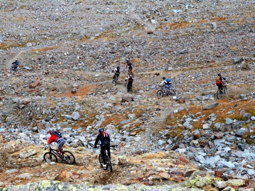The robust ascent through the Fimbatal brings us to the Heidelberger hut. Arduous 300 hm we push to Fimberpass. A five star single trail ride down on the secret paths down to the Engadine. The splendid setting of a remote canyon sweeten us up at the 600 m S-carl.
